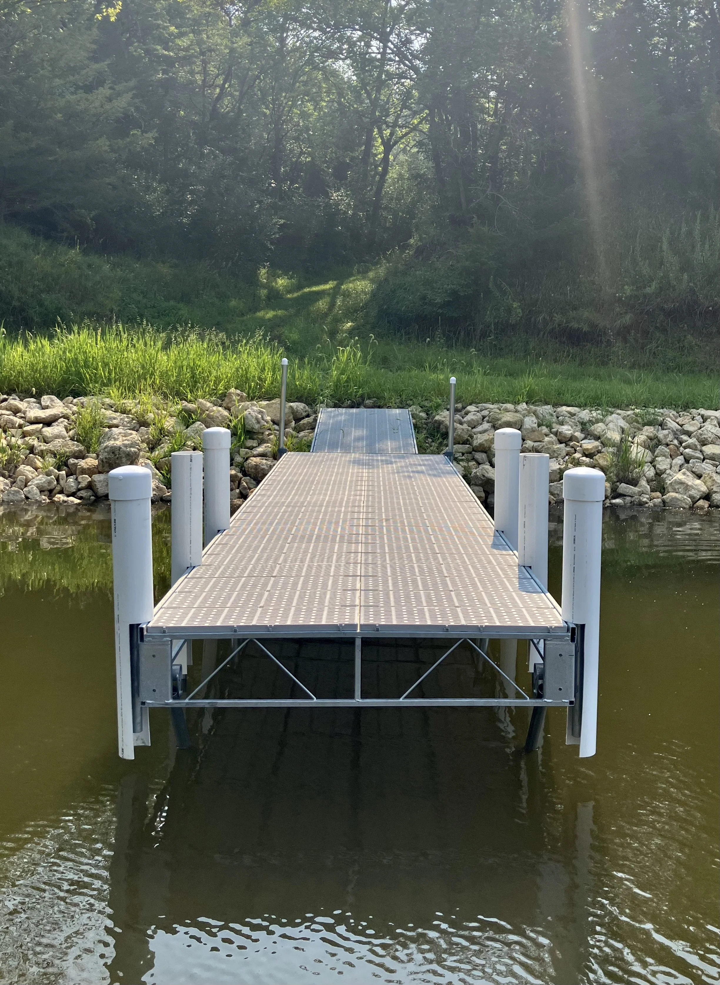 After securing approval from the LPA board of directors, Friends purchased the six-feet-wide roll-in dock, with a four-feet-wide plank from the dock to shore. It is located in the large cove immediately north of the Lake Panorama dam.